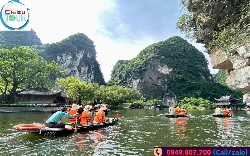 Đoàn đến Khu Du Lịch Tràng An. Khu du lịch là một vùng non nước, mây trời hoà quyện. Đáy nước trong xanh soi bóng những vách núi đá trùng điệp. Nơi đây có tới 31 hồ, đầm nước được nối thông bởi 48hang, động đã được phát hiện trong đó có những hang xuyên thủy dài 2km như hang Địa Linh, hang Sinh Dược, hang Mây (thời gian ngồi trên thuyền chèo khoảng 2 tiếng đến 2.5 tiếng để tham quan hết thắng cảnh này )